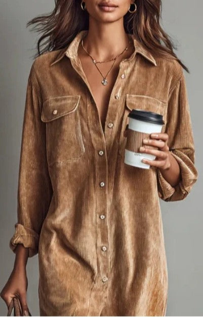 El Vestido Canela está confeccionado en una suave pana de tacto agradable, con ese punto de textura que lo convierte en una prenda acogedora pero muy sofisticada. Su diseño camisero clásico con botones delanteros le aporta versatilidad y un aire relajado, ideal para llevar tanto con botas como con zapatillas.